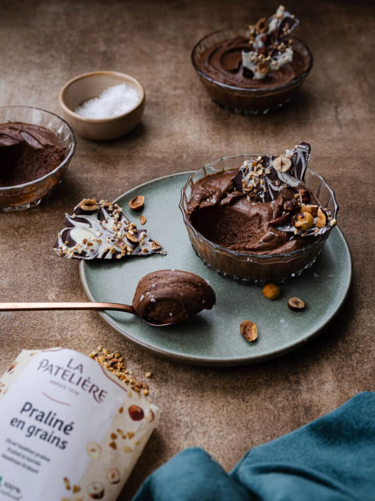 - Au moment de servir, plantez des éclats de chocolat et fruits secs dans la mousse et servez de suite.
